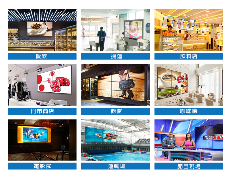 - 提供 8 種電視牆拼接組合模式,例如 2x2、1x2、2x1、3x1、1x3、1x4、4x1、1x1...等拼接螢幕組合。